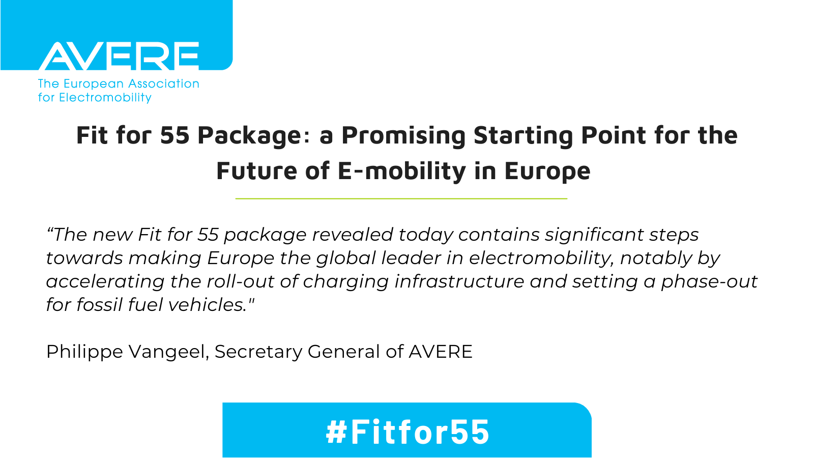 Philippe Vangeel, Secretary General of AVERE stated: “The new Fit for 55 package revealed today contains significant steps towards making Europe the global leader in electromobility, notably by accelerating the roll-out of charging infrastructure and setting a phase-out for fossil fuel vehicles. We’ll be now looking into ways to strengthen the proposed policies further, to ensure we can reach the crucial goal of carbon neutral transport by 2050“